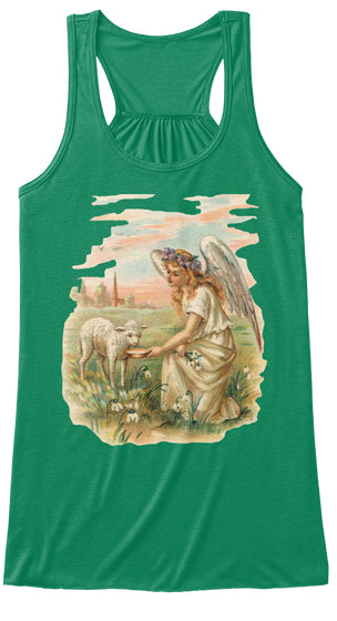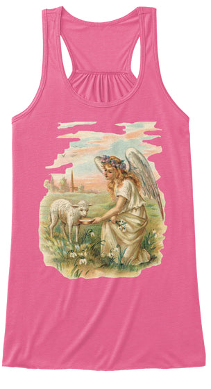 Womens Flowy Tank Top with Antique Angel Feeding a Lamb